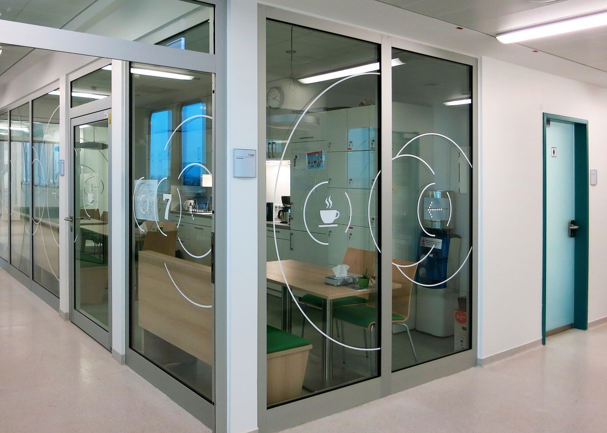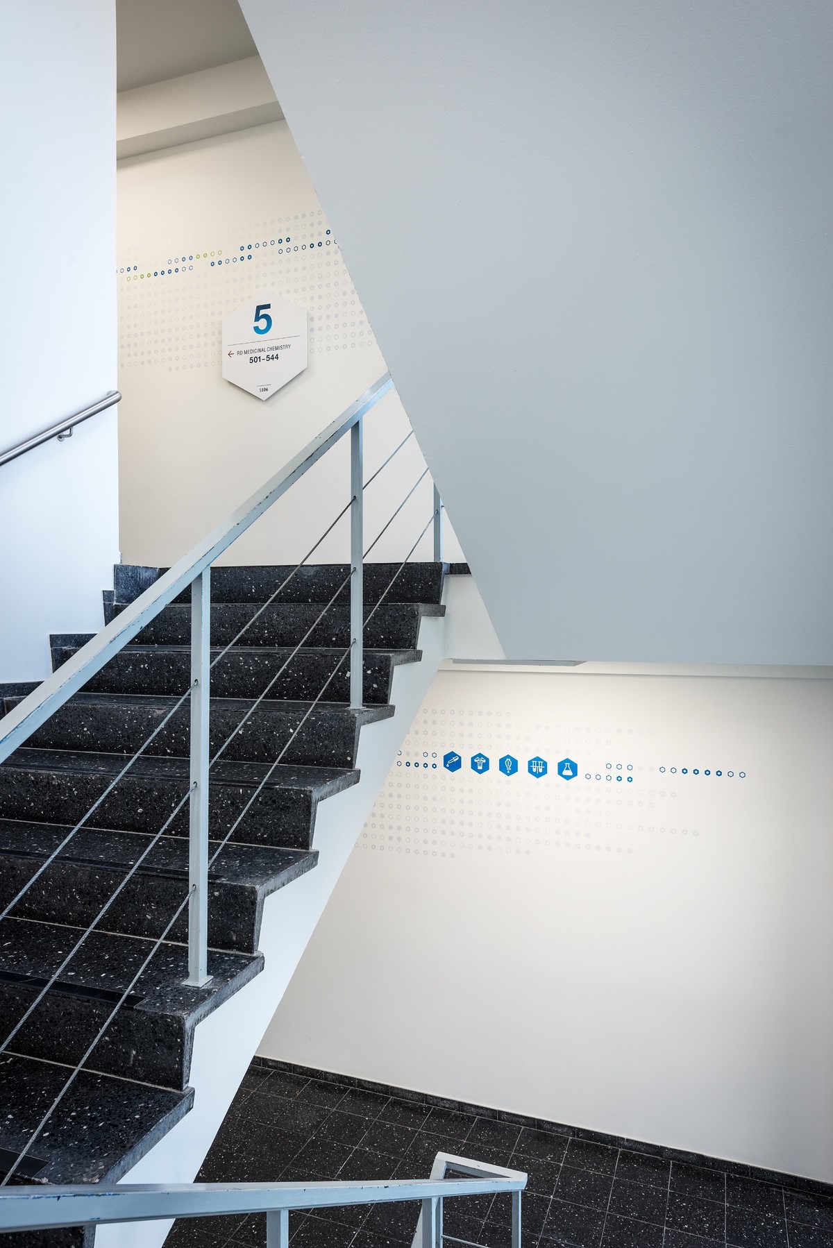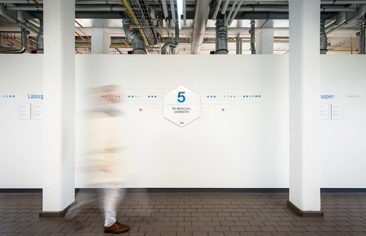 Das Gebäudeleitsystem basiert auf dem Bayer Corporate Design. Informationen zur Wegeführung und zu den einzelnen Forschungsbereichen sind grafisch großflächig und gut erkennbar auf die Wände platziert. Diese Gebäudeleitsystem unterscheidet sich von konventionellen Kennzeichnungen und setzt und in dem Gebäude gestalterische Akzente.