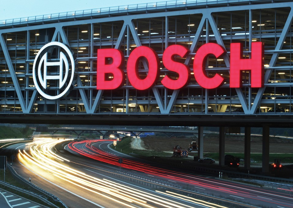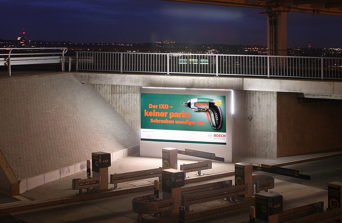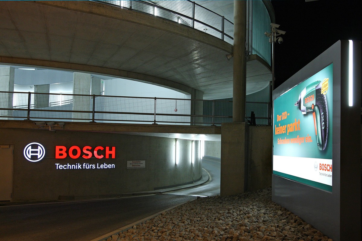 Für das Parkhaus der Messe Stuttgart wurden individuell hinterleuchtete Werbeelemente und Bosch Gebäudekennzeichnungen in unterschiedlichen Größen gestaltet.