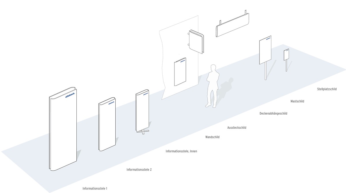 Das neue Wegeleitsystem verbindet das Corporate Design ästhetisch mit der Formsprache der Otto Bock Gebäude- und der Messearchitektur.