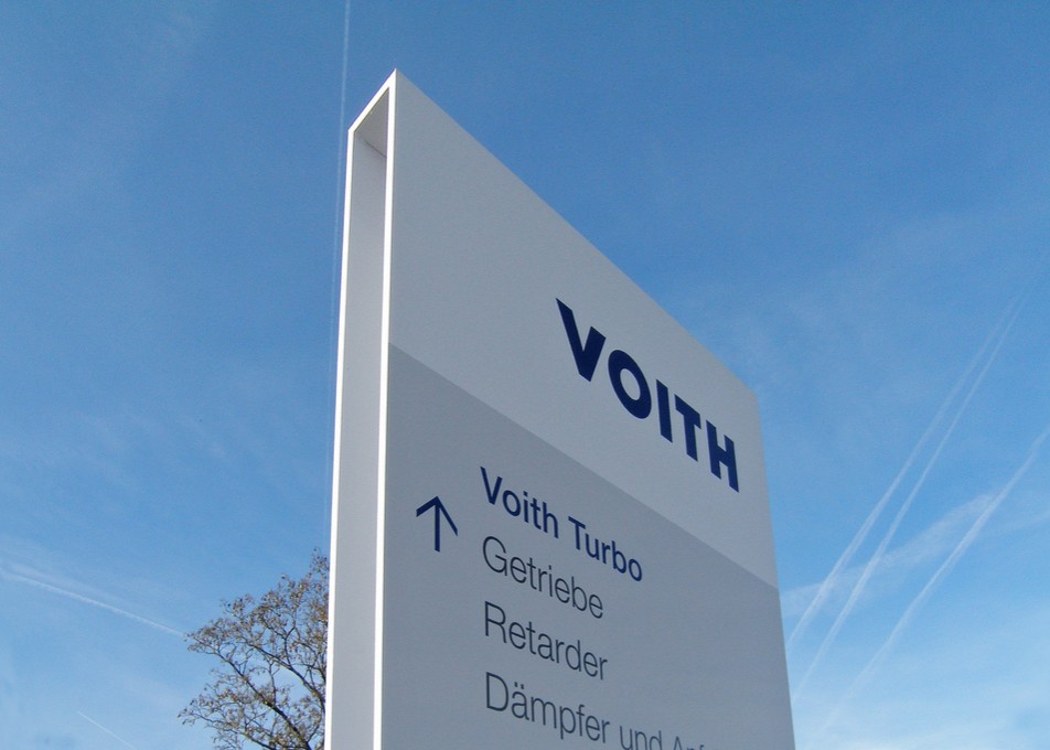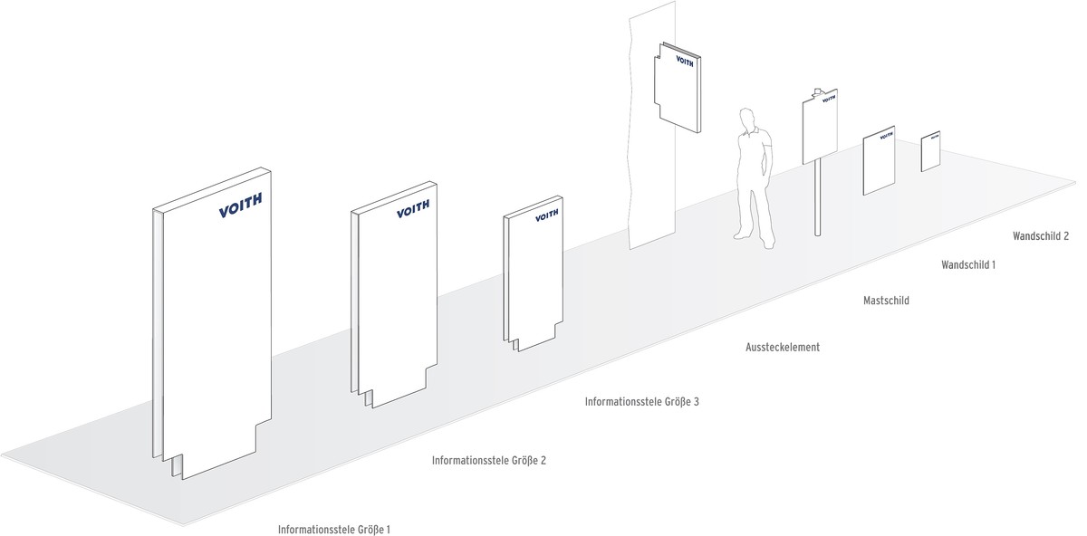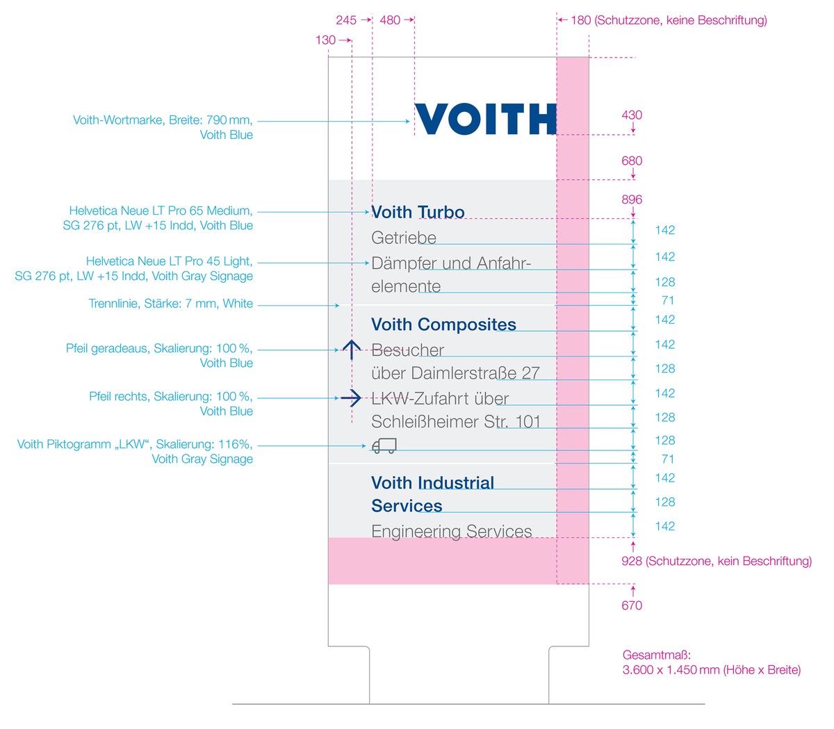 Die Voith Standorte sind über Jahre historisch gewachsen. Die Werksarchitektur wirkt daher sehr unterschiedlich. Das neue Wegeleitsystem und die Gebäudekennzeichnungen verbinden die Marke Voith mit der Architektur und verleihen den Standorten ein einheitliches Gesicht.