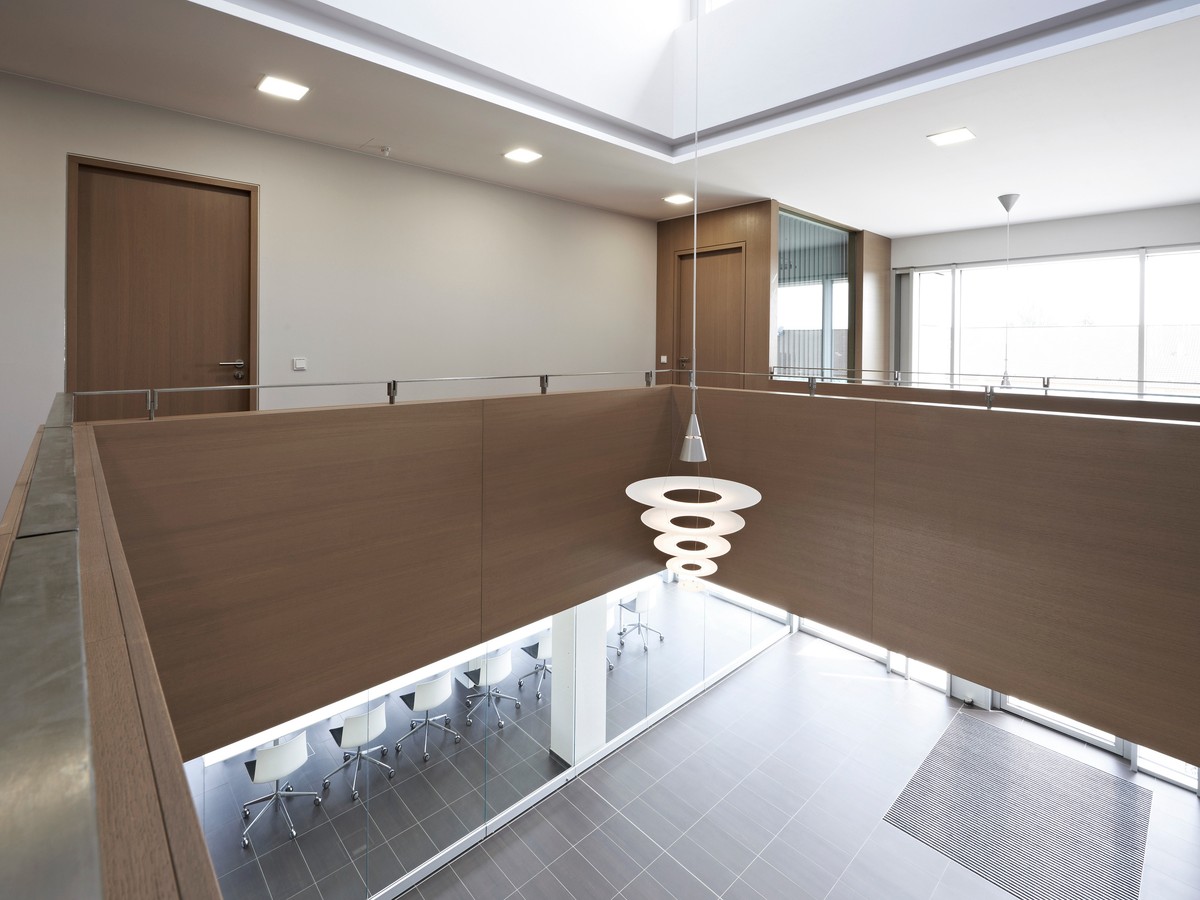 Die klare und eindeutige Formsprache der Architektur ist Ausdruck für die Berghof Innovationskraft. Der offene Gebäudegrundriss soll dabei die interne Kommunikation unterstützen. Im Innenbereich steht die Verwendung von verwittertem Eichenholz für Zuverlässigkeit und Tradition. Die warm rote CI-Farbgebung der Wandflächen und des Bodenbelags sorgen für ein wohnliches Arbeitsklima.