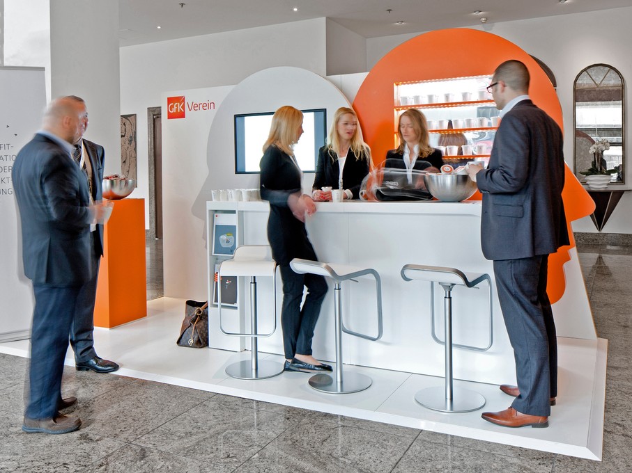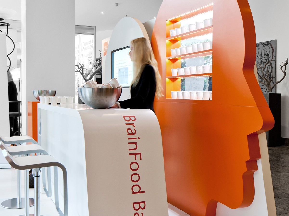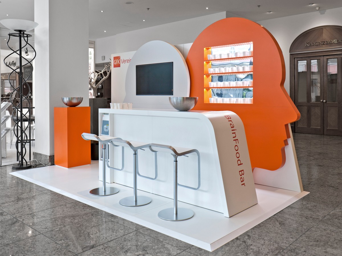 Thema des Messestandes ist „Brain Food“ und was die Ernährung positiv für Konsumenten bewirken kann. Im Mittelpunkt des Standkonzepts stehen zwei Kopfsilhouetten, die als
