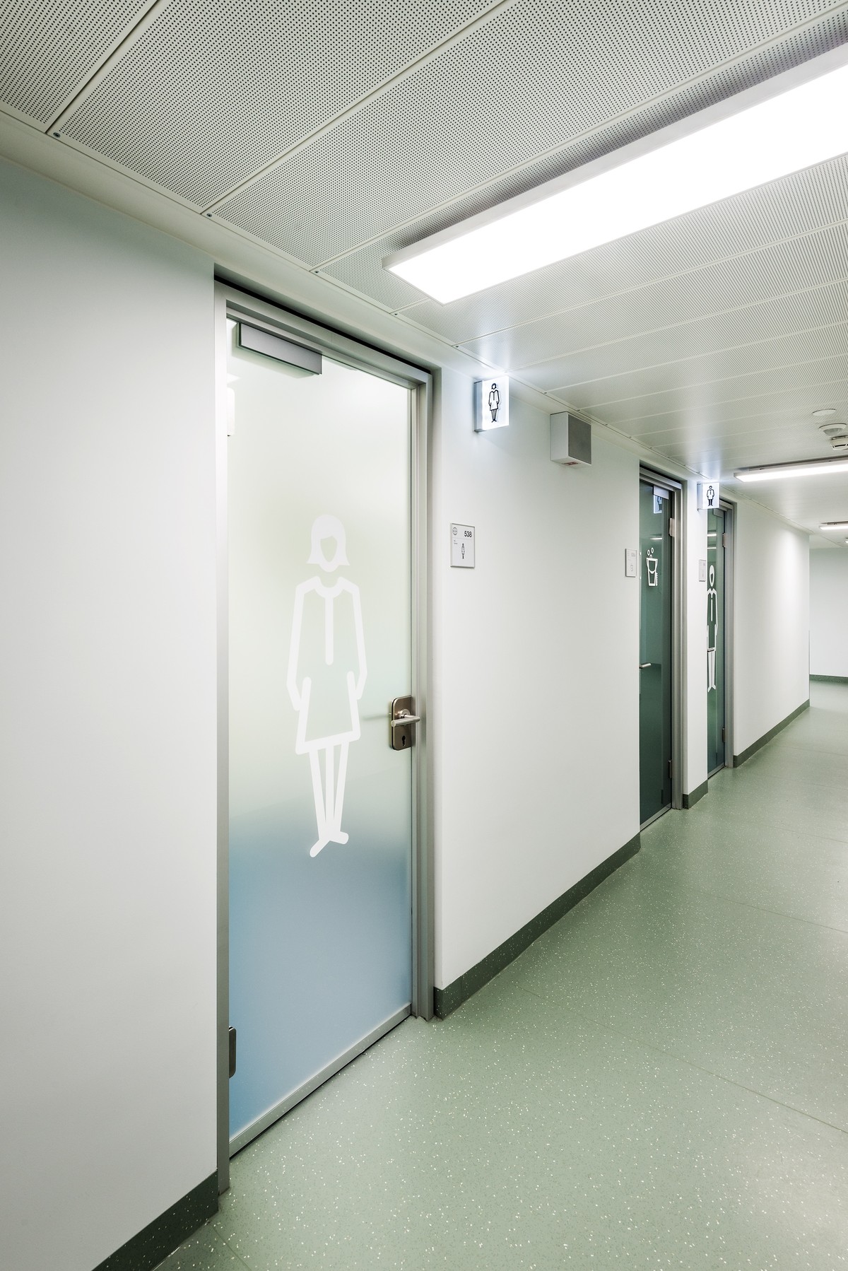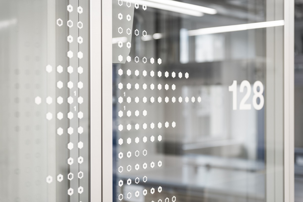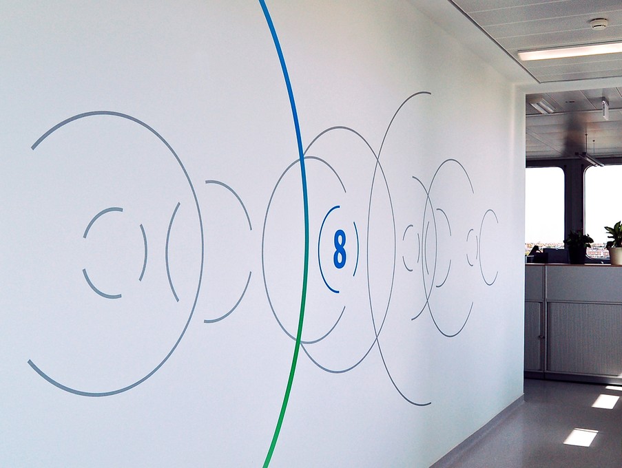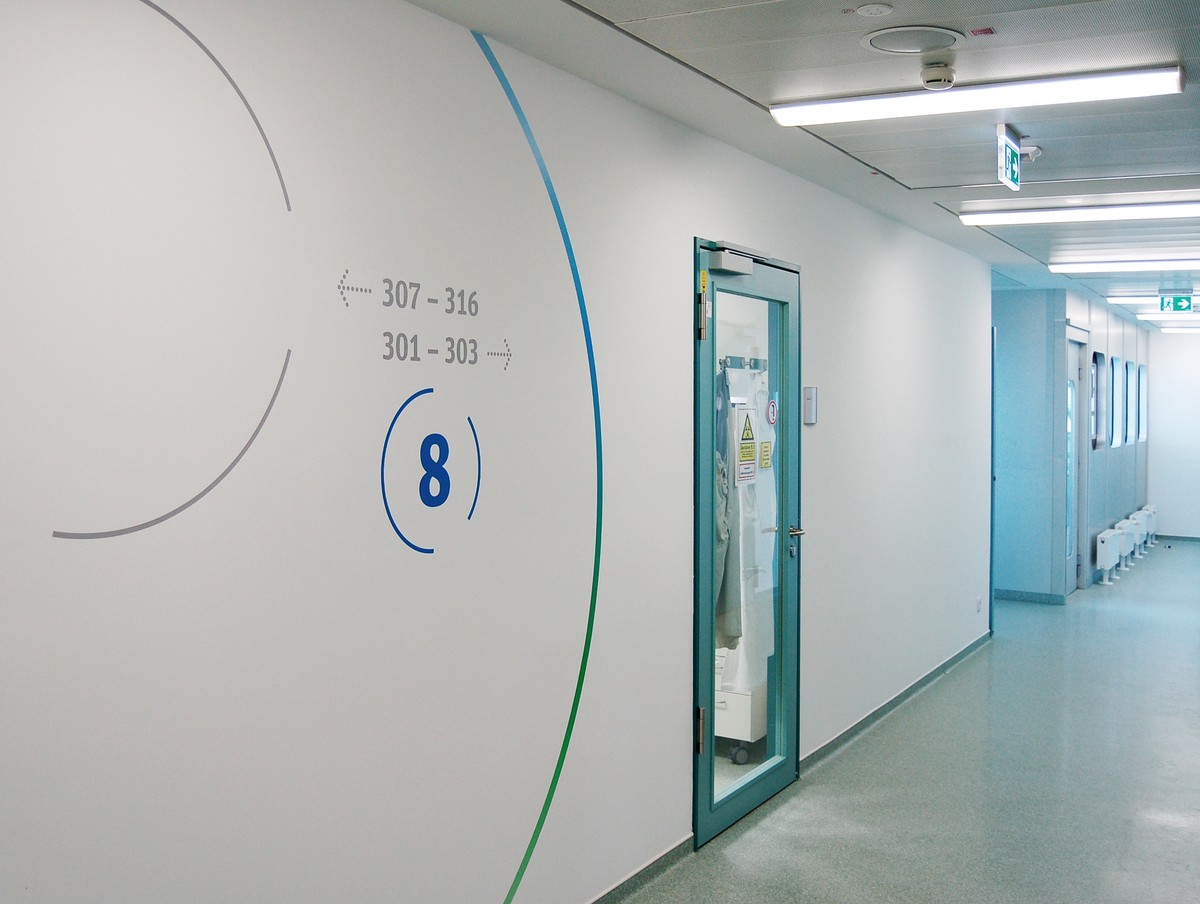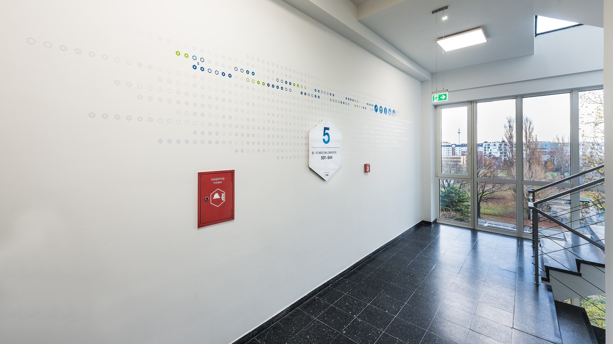 Das Gebäudeleitsystem basiert auf dem Bayer Corporate Design. Informationen zur Wegeführung und zu den einzelnen Forschungsbereichen sind grafisch großflächig und gut erkennbar auf die Wände platziert. Diese Gebäudeleitsystem unterscheidet sich von konventionellen Kennzeichnungen und setzt und in dem Gebäude gestalterische Akzente.