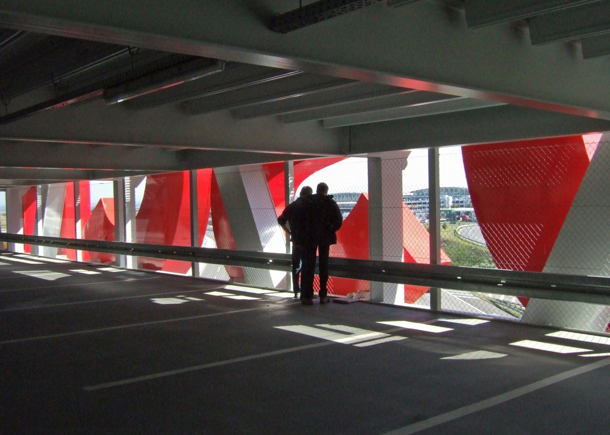 Das Bosch Logo der Parkhausbrücke hat eine Gesamthöhe von 13 m und ist als Fernkennzeichnung kilometerweit sichtbar.