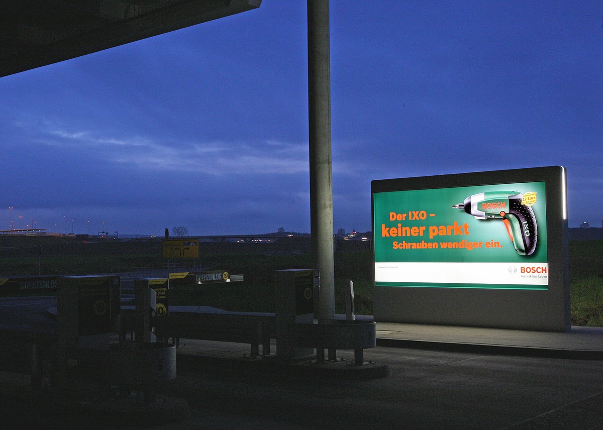 Für das Parkhaus der Messe Stuttgart wurden individuell hinterleuchtete Werbeelemente und Bosch Gebäudekennzeichnungen in unterschiedlichen Größen gestaltet.