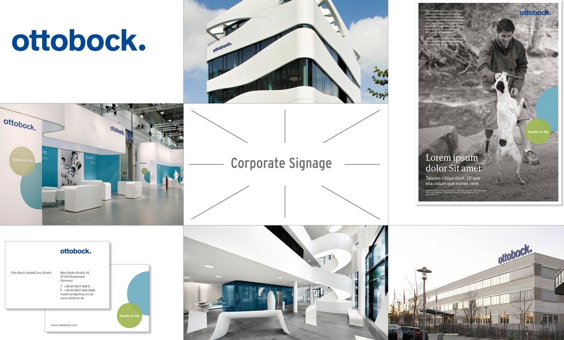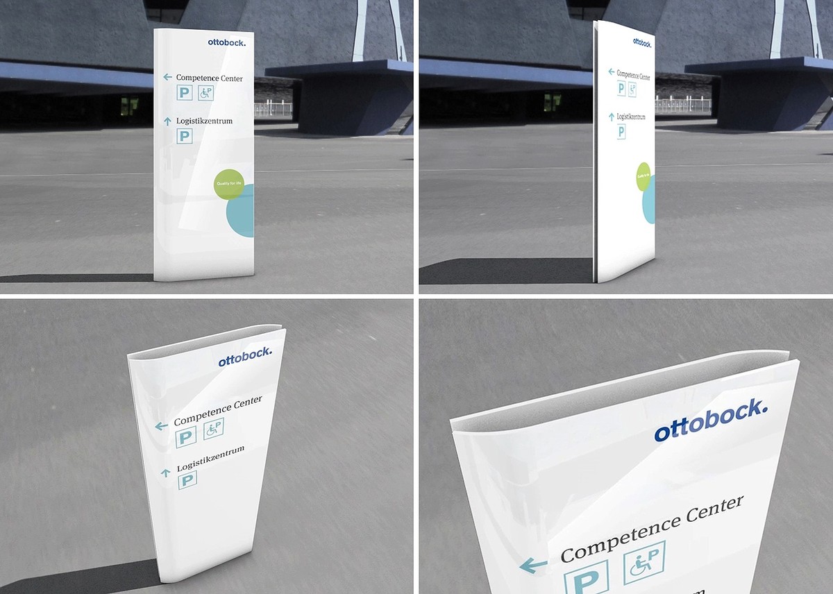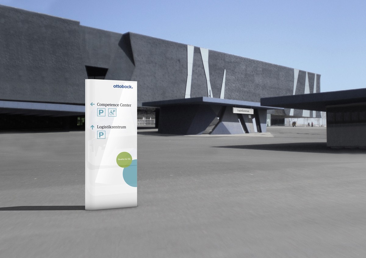 Das neue Wegeleitsystem verbindet das Corporate Design ästhetisch mit der Formsprache der Otto Bock Gebäude- und der Messearchitektur.