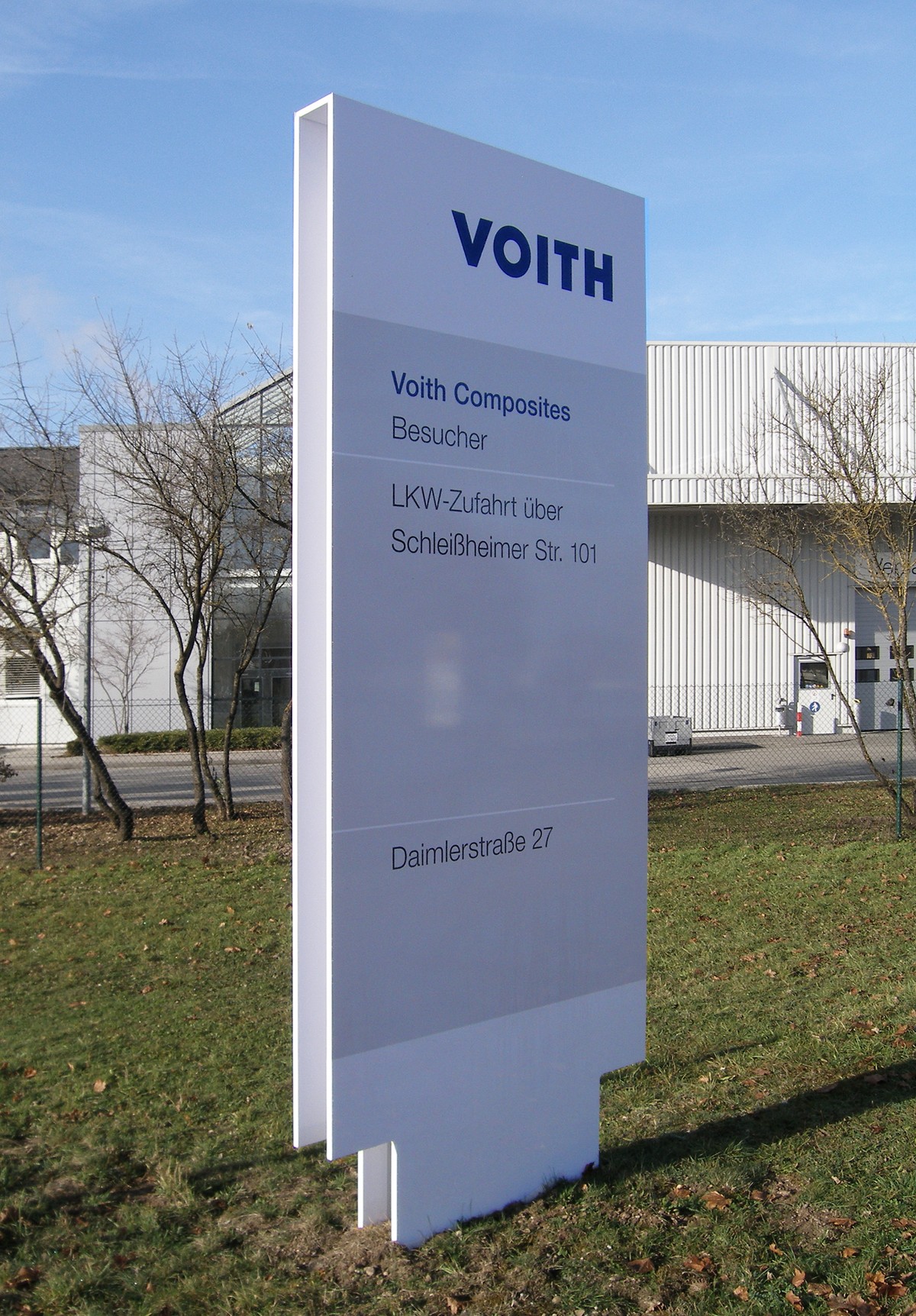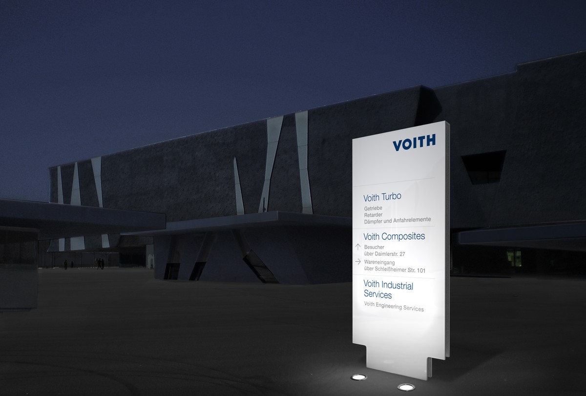 Die Voith Standorte sind über Jahre historisch gewachsen. Die Werksarchitektur wirkt daher sehr unterschiedlich. Das neue Wegeleitsystem und die Gebäudekennzeichnungen verbinden die Marke Voith mit der Architektur und verleihen den Standorten ein einheitliches Gesicht.