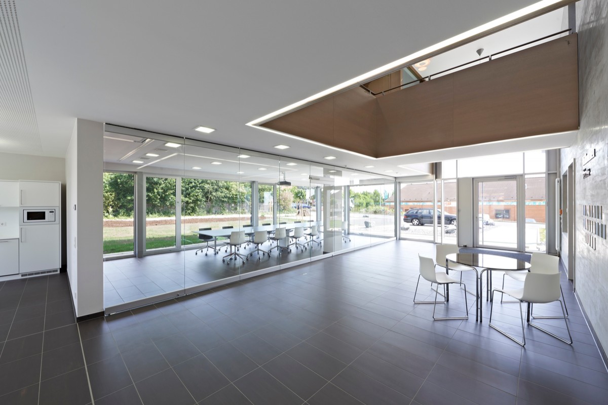 Die klare und eindeutige Formsprache der Architektur ist Ausdruck für die Berghof Innovationskraft. Der offene Gebäudegrundriss soll dabei die interne Kommunikation unterstützen. Im Innenbereich steht die Verwendung von verwittertem Eichenholz für Zuverlässigkeit und Tradition. Die warm rote CI-Farbgebung der Wandflächen und des Bodenbelags sorgen für ein wohnliches Arbeitsklima.