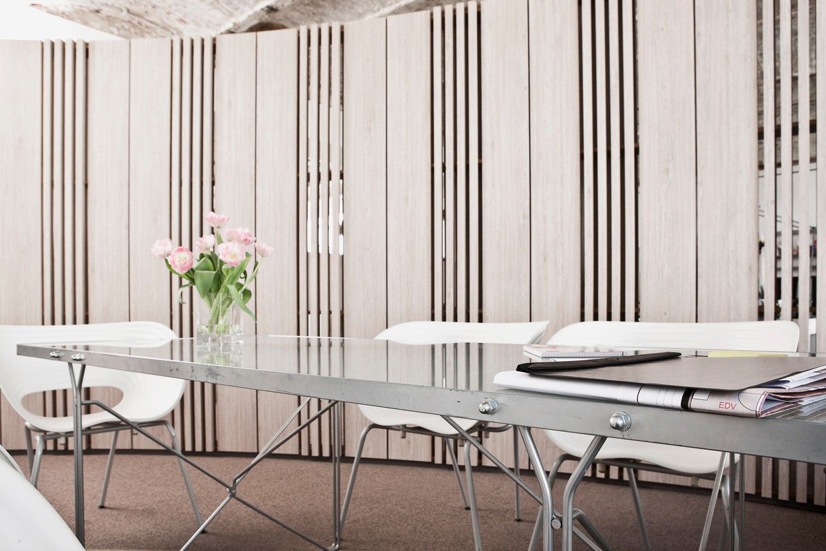 Kabel und Stromleitungen sind offen und sichtbar verlegt. Transparente Raumteiler aus gebleichtem Holz bilden die zentralen Gestaltungselemente. Sie strukturieren das Loft in Arbeits-, Funktions- und Kommunikationsbereiche. Durch die niedrige Höhe und Transparenz der Raumteiler bleibt die Großzügigkeit des Lofts erhalten.